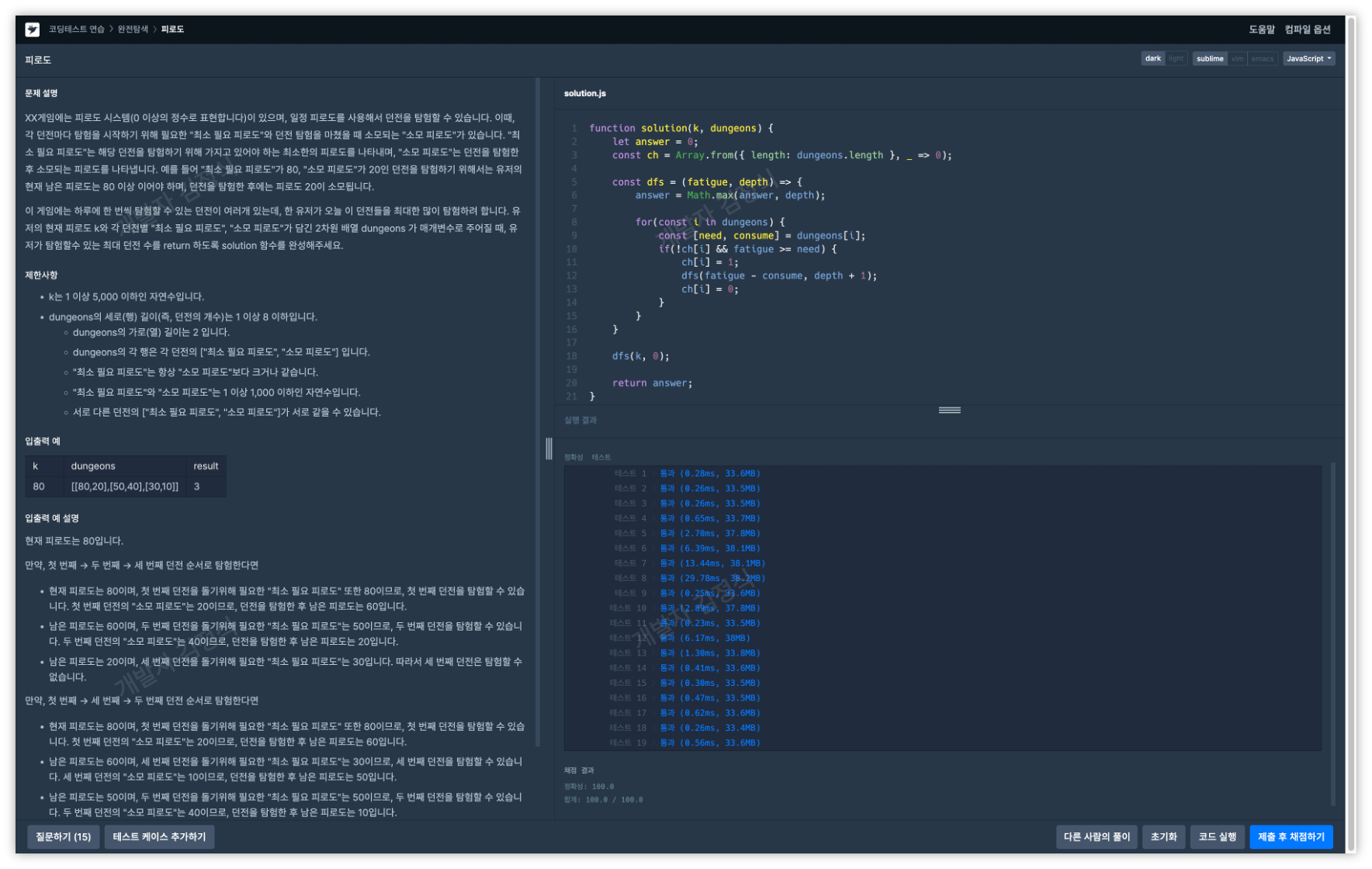 프로그래머스 코딩테스트 연습 Level 2 - 피로도 (JavaScript)