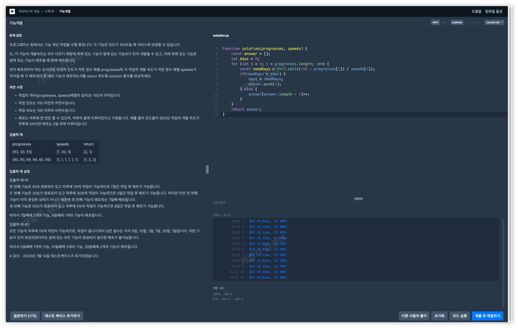 - 작업의 개수(progresses, speeds배열의 길이)는 100개 이하입니다.