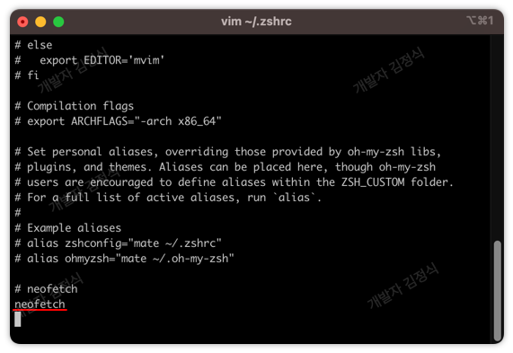 설치가 끝났으면, zshrc 설정 파일(~/.zshrc 경로의 파일)을 열어 neofetch 사용할 수 있도록 추가해주어야 합니다.
