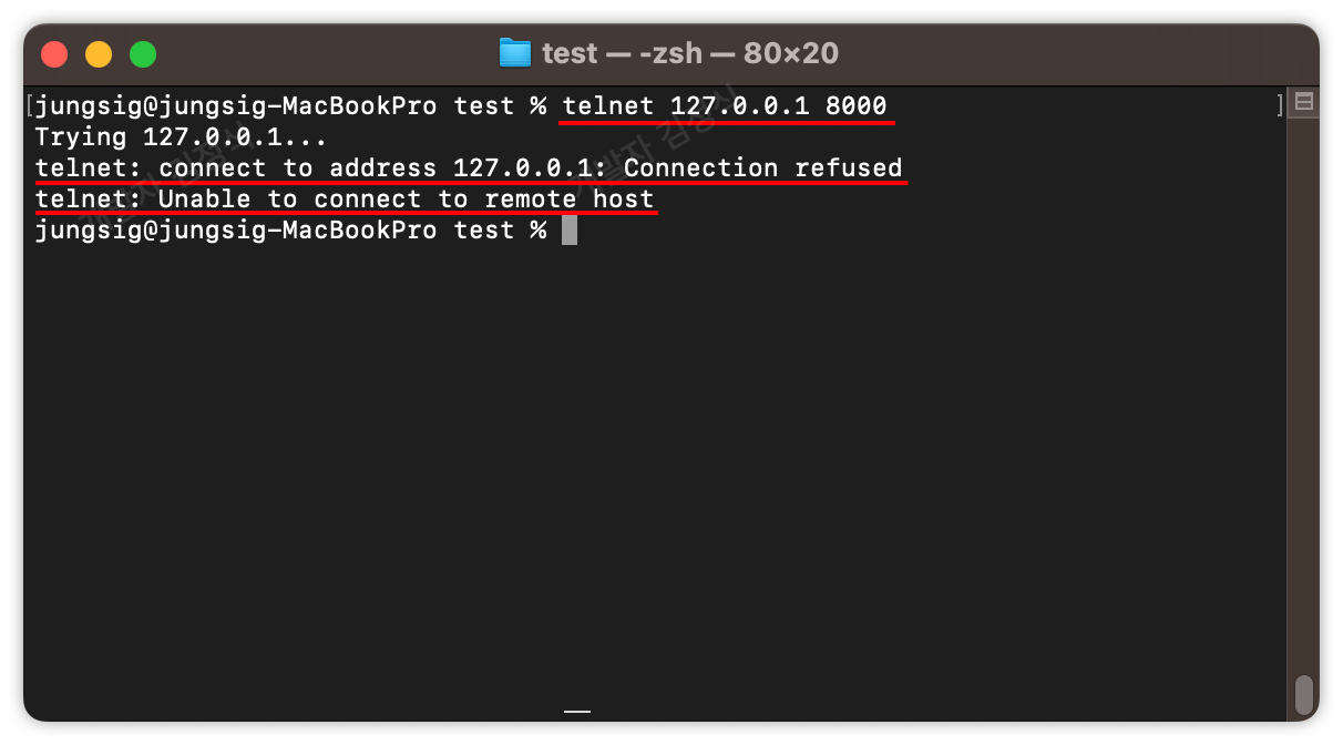 로컬에서 8000 포트에 아무 서버도 실행시키지 않은 상태에서 telnet을 사용해본 예시입니다.