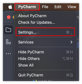 맥을 기준으로 PyCharm > Settings 를 클릭하거나,
