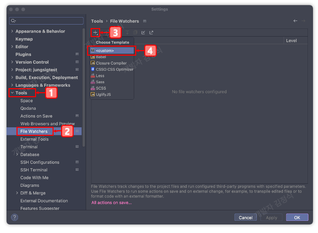 Settings 창에서 Tools > File Watchers 탭으로 들어갑니다.
