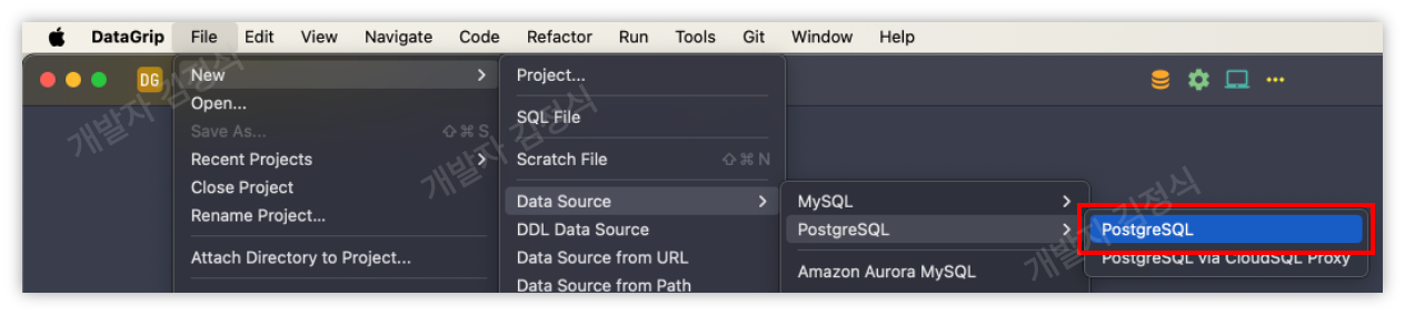 1. DataGrip 에서 File > New > Data Source > PostgreSQL > PostgreSQL 을 선택합니다.