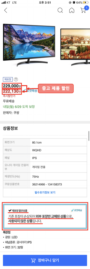 중고 상품에 재포장 할인상품, 박스 훼손 할인상품이 있었습니다.