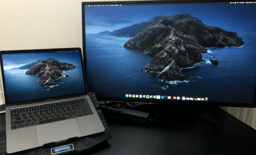 양쪽 사진의 왼쪽에 화면은 맥북 화면이고 오른쪽 화면은 한성컴퓨터 ULTRON 3278 모니터 입니다.