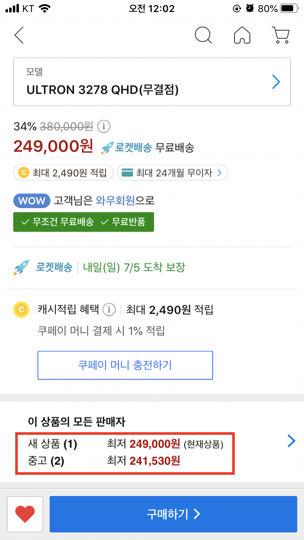 아래쪽에 내려보니 쿠팡에 중고 상품이라는 것이 있다는 것을 발견했습니다.