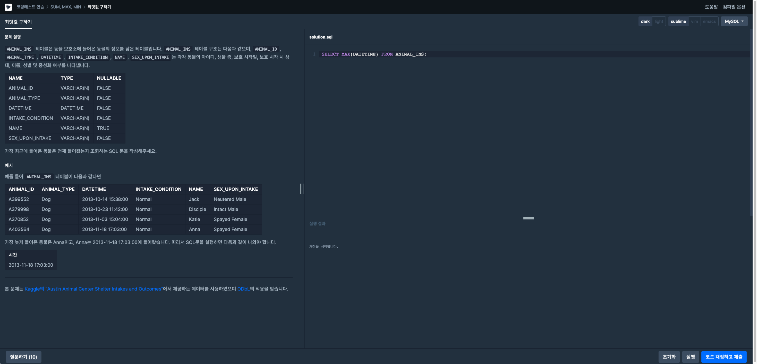 최댓값 구하기 문제를 MYSQL로 해결 해보도록 하겠습니다.