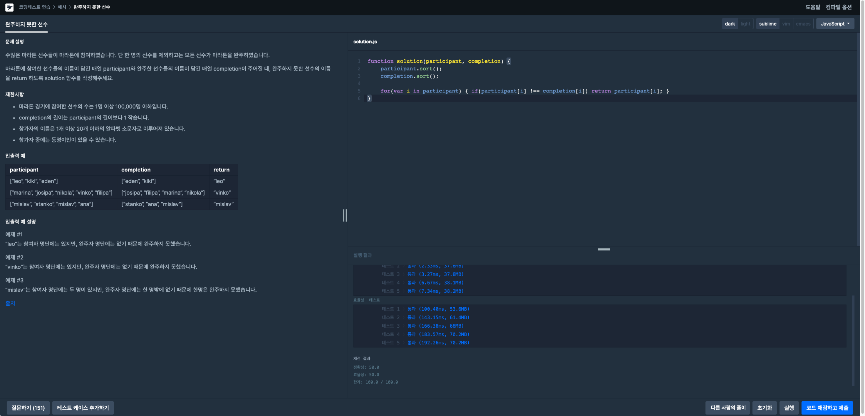 완주하지 못한 선수 문제를 JavaScript로 해결 해보도록 하겠습니다.