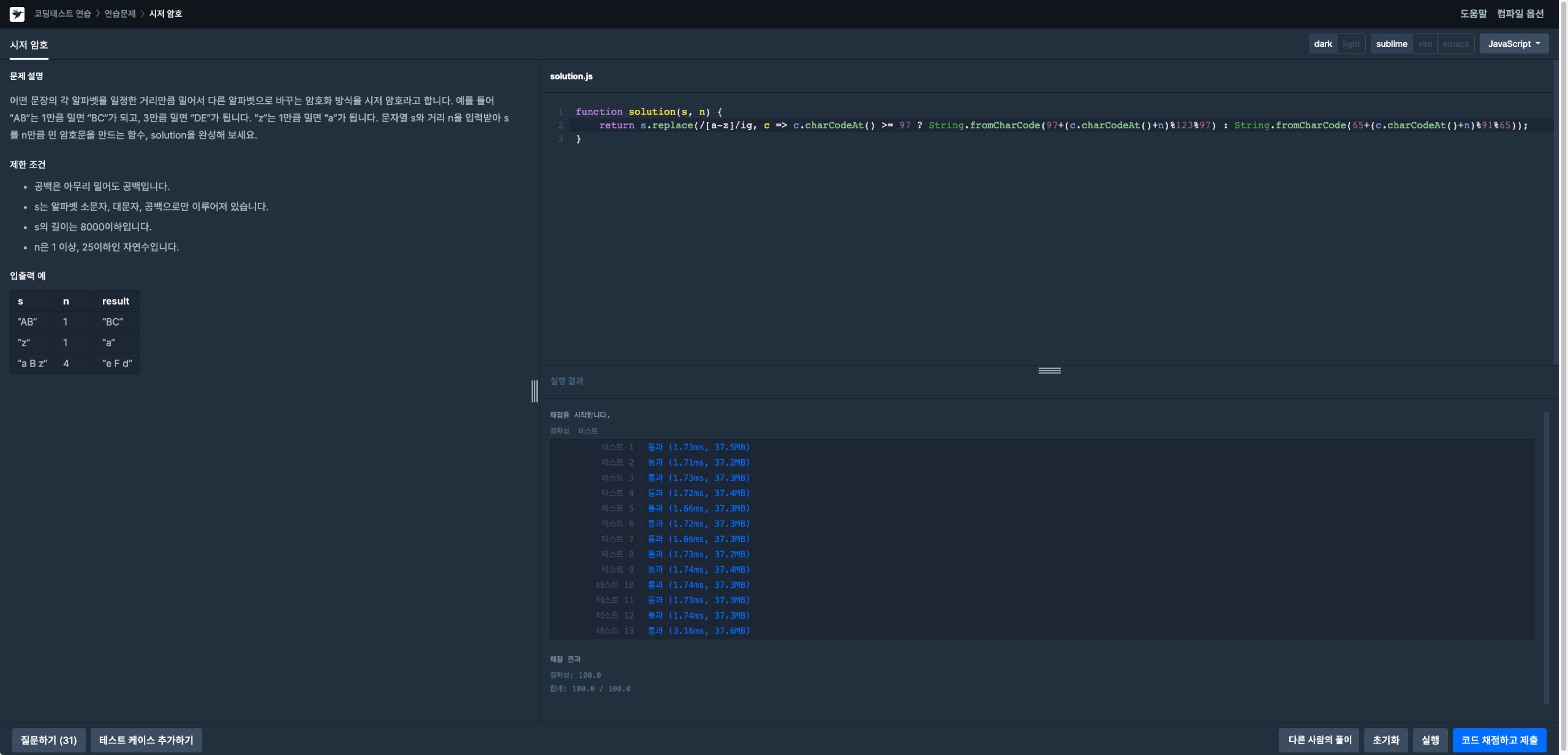 Programmers 프로그래머스 코딩테스트 연습 - 시저 암호 (JavaScript)