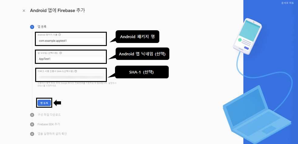 앱 닉네임과 SHA-1지문은 선택사항인데