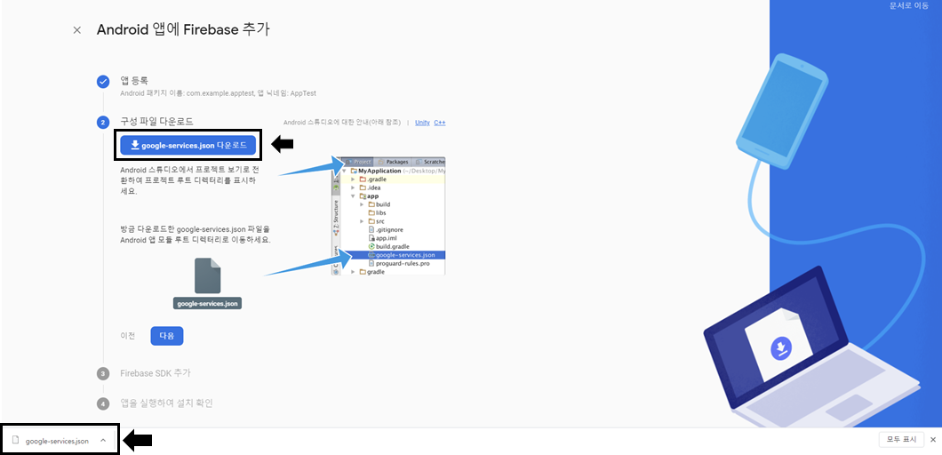 "google-services.json 다운로드" 버튼을 클릭하여 json 파일을 다운로드 받습니다.