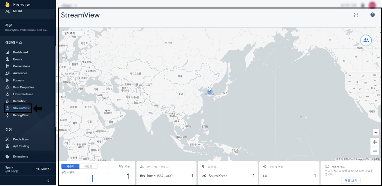 Firebase의 왼쪽 메뉴에서 애널리틱스 > Dashboad 에 들어가 보시면