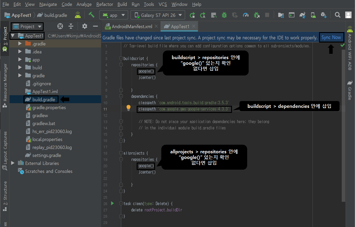 1) 프로젝트 디렉터리의 Gradle 파일(build.gradle)에 들어가서 위와 같이 확인하고 정확한 위치에