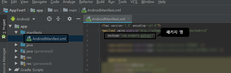 패키지 명을 모르시는 분들은 아래와 같이 AndroidManifest에서 다시 확인하실 수 있습니다.