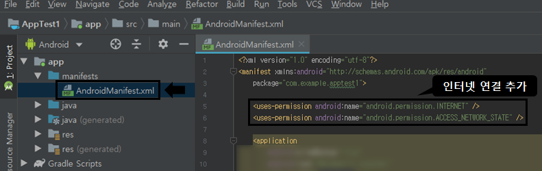 생성된 패키지와 Firbase 서버를 연결하기 위해 AndroidManifest에서 인터넷 사용 권한을 부여해줍니다.