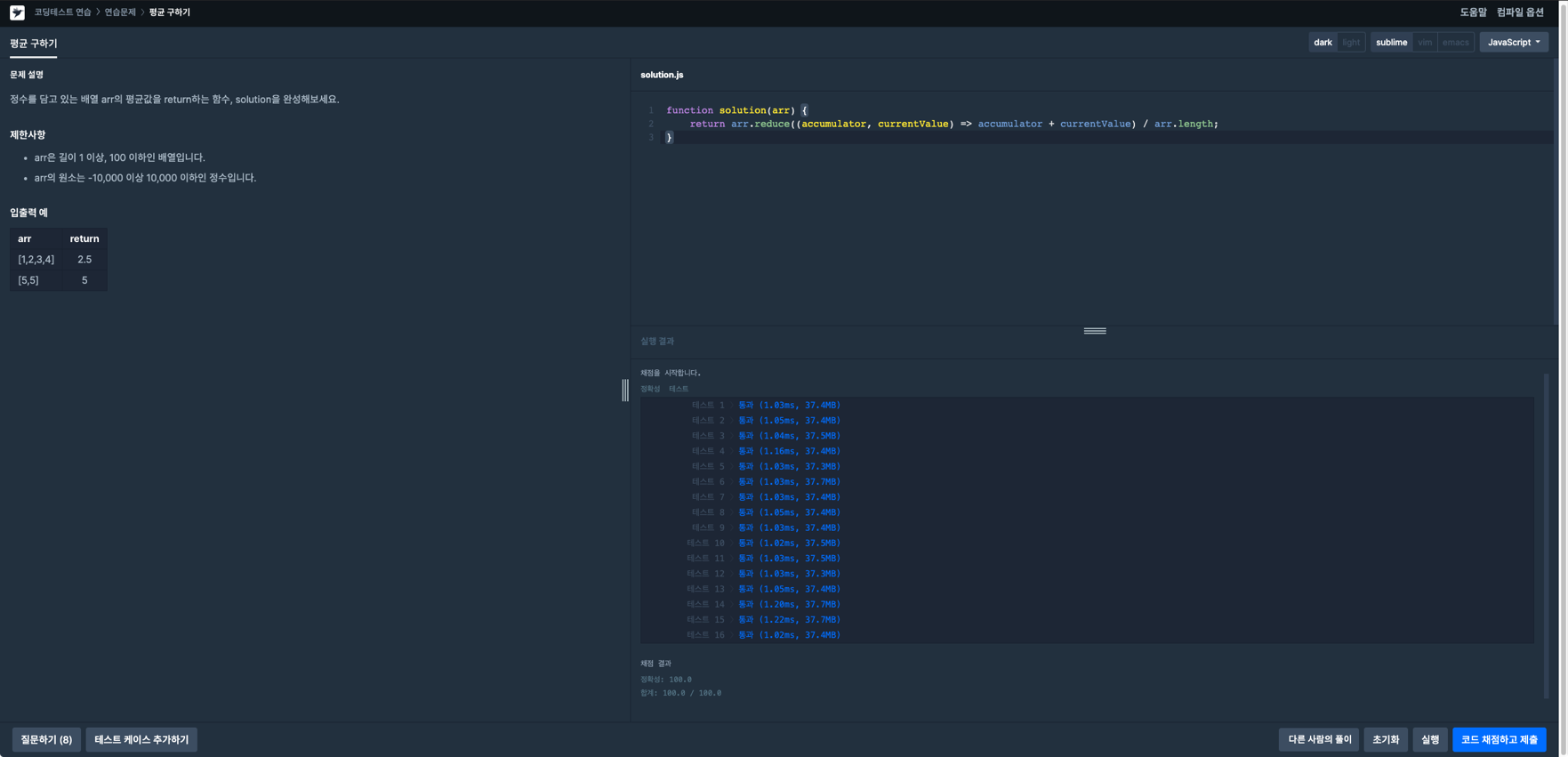 Programmers 프로그래머스 코딩테스트 연습 - 평균 구하기 (JavaScript)
