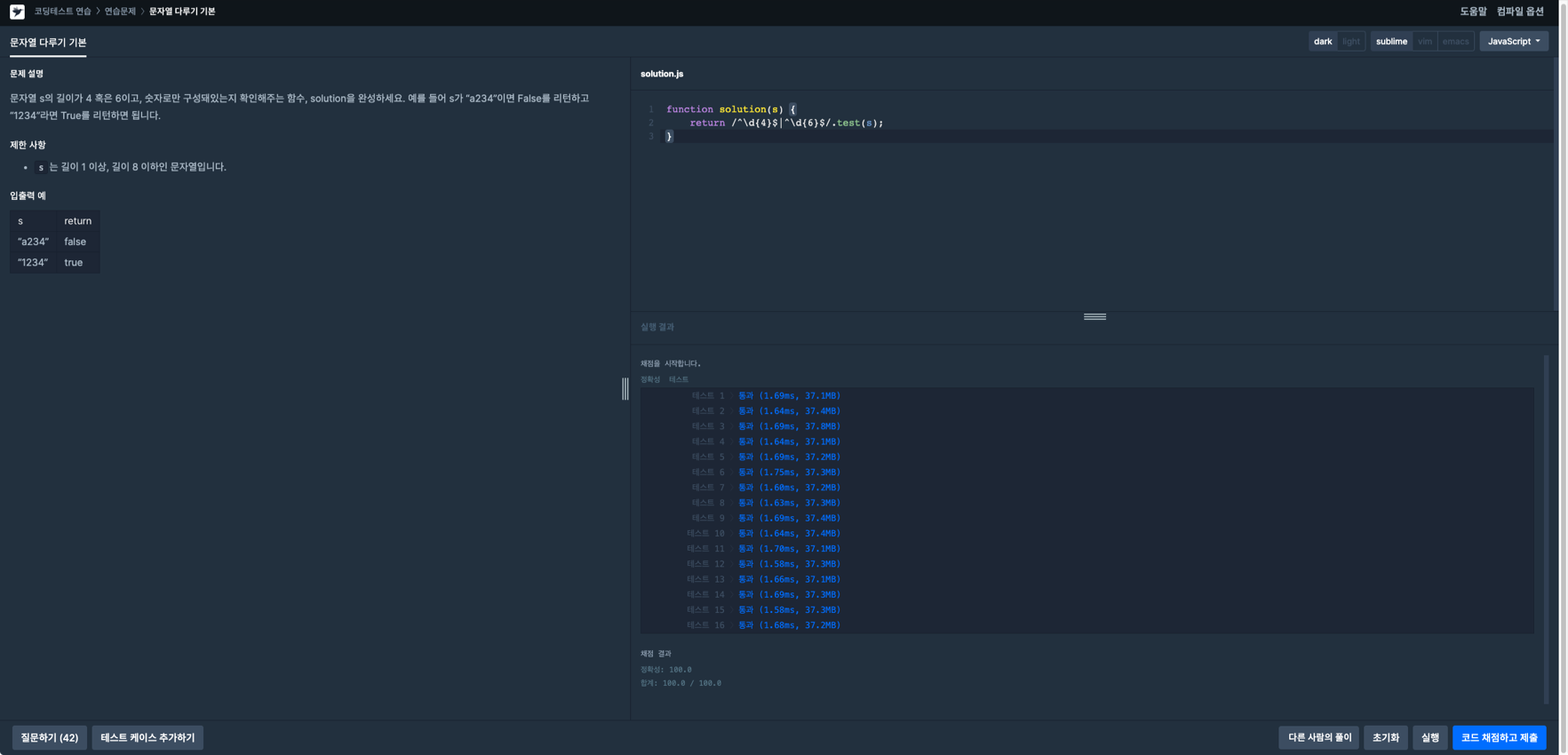 이렇게하여 문자열 s가 길이가 4 혹은 6이고, 숫자로만 구성돼있는지, 오직 정규식만으로 문제를 이렇게 쉽고 간단하게 해결할 수 있습니다.