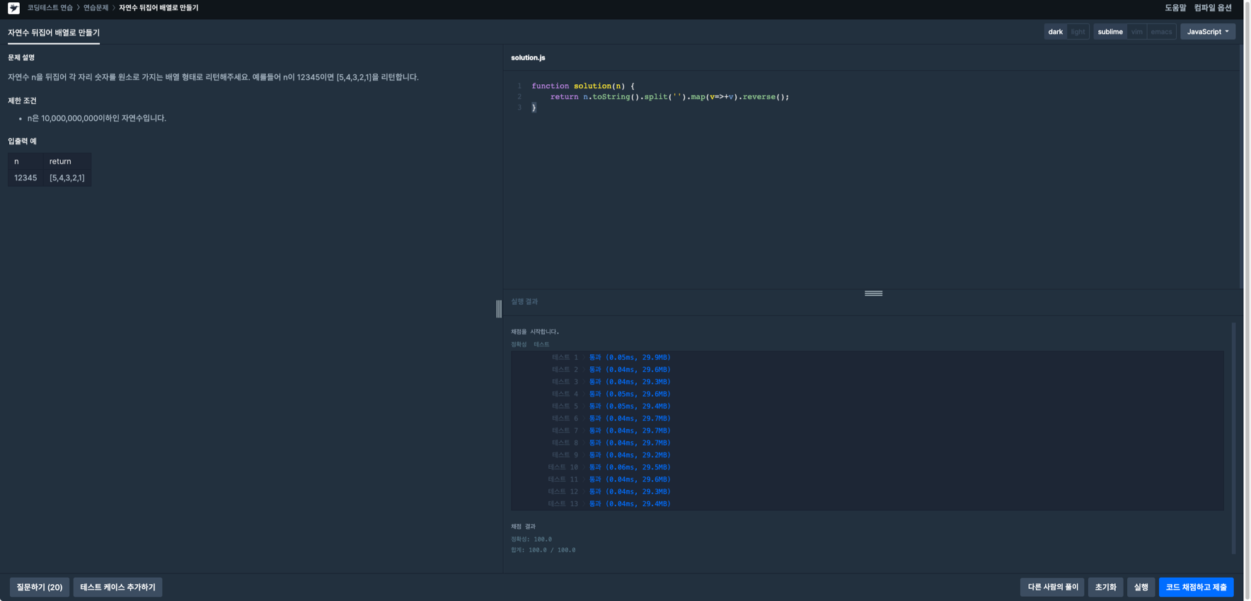 자연수 n을 뒤집어 각 자리 숫자를 원소로 가지는 배열 형태로 리턴해주는 문제입니다.