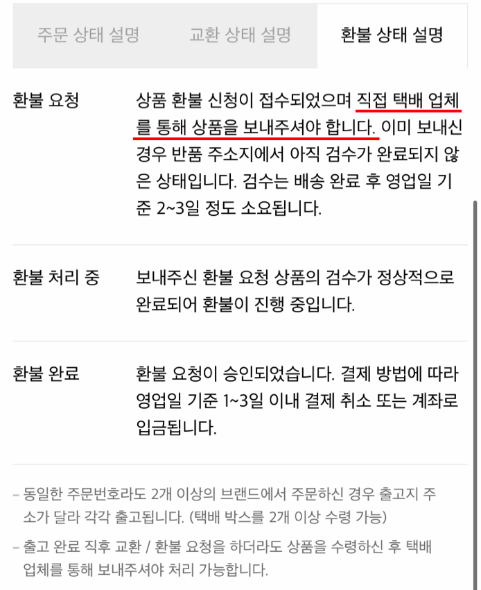 참고 사항에도 "택배사에 직접 반품 접수 후 보내주세요." 라고 적혀 있습니다.