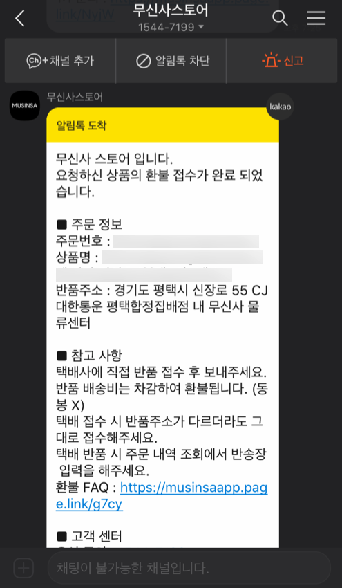 환불요청이 완료되면 이렇게 무신사스토어에서 카톡으로 알림도 옵니다!