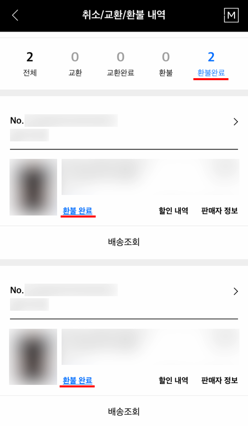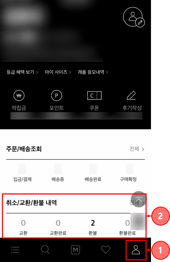다시 앱의 마이페이지에 들어가 취소/교환/환불 내역에 들어갑니다.
