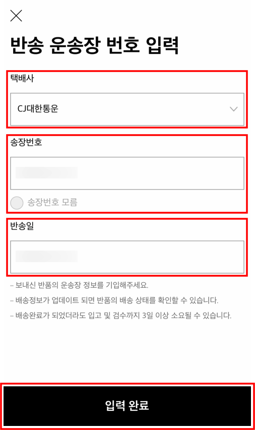 반송장 입력에 들어가시면 위와 같이 택배사, 송장번호, 반송일을 입력하시고 입력 완료 버튼을 누르시면 됩니다.