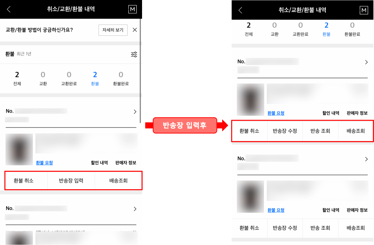 반송장을 입력하고 나오시면 환불할 제품 하단 메뉴에서 반송장 입력이 사라지고 반송장 수정과 반송 조회가 보입니다.