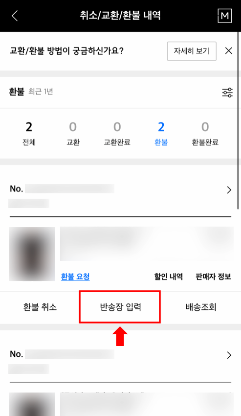 반품 신청한 제품의 아래에 반송장 입력 버튼을 터치하여 들어갑니다.