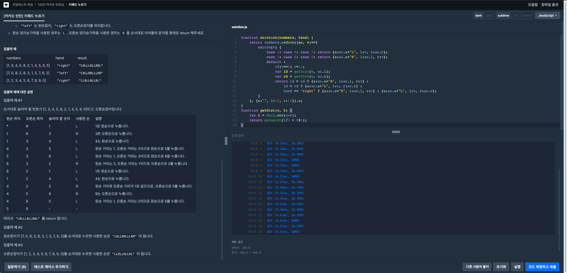 Programmers(프로그래머스)의 코딩테스트 연습문제 Level 1 중 2020 카카오 인턴십 문제인 키패드 누르기 문제를 JavaScript를 사용하여 문제를 풀어보도록 하겠습니다.