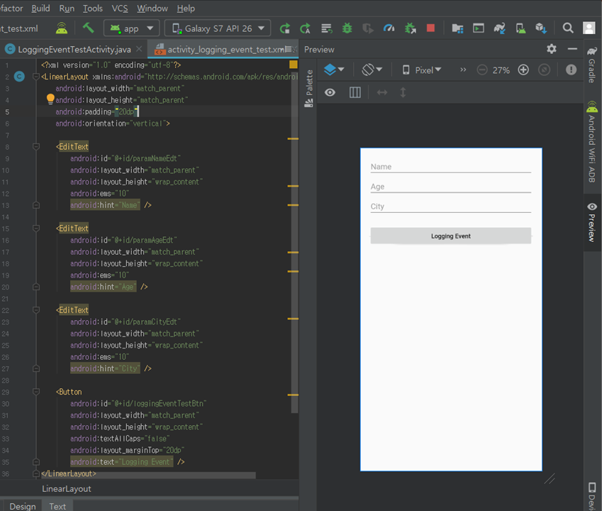 코드를 보시면 아시겠지만 "Logging Event" 버튼을 터치하면 EditText에 입력한 값을 가져와