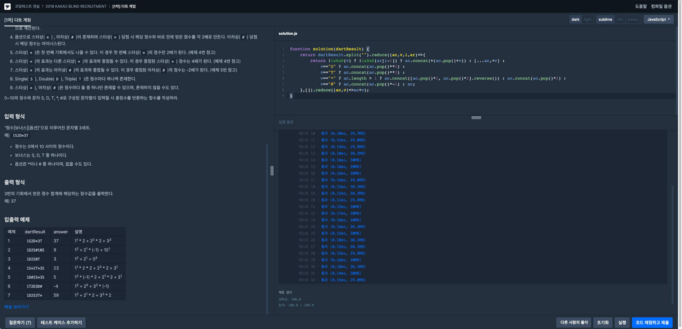 Programmers(프로그래머스)의 코딩테스트 연습문제 Level 1 중 2018 KAKAO BLIND RECRUITMENT 문제인 [1차] 다트 게임 문제를 JavaScript를 사용하여 문제를 풀어보도록 하겠습니다.