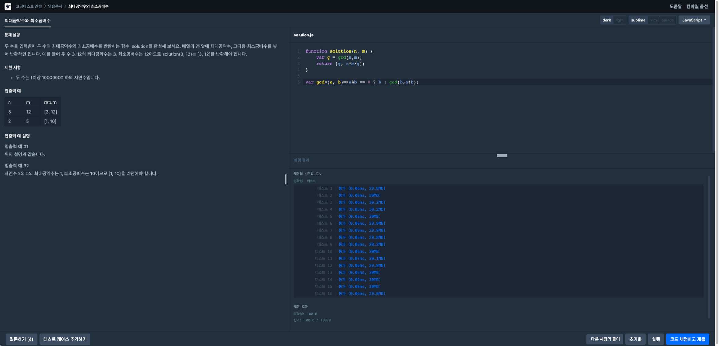 이제 최대공약수와 최소공배수를 모두 구했으므로 두 숫자를 배열로 return 해주시기만 하면 문제를 해결하실 수 있습니다.