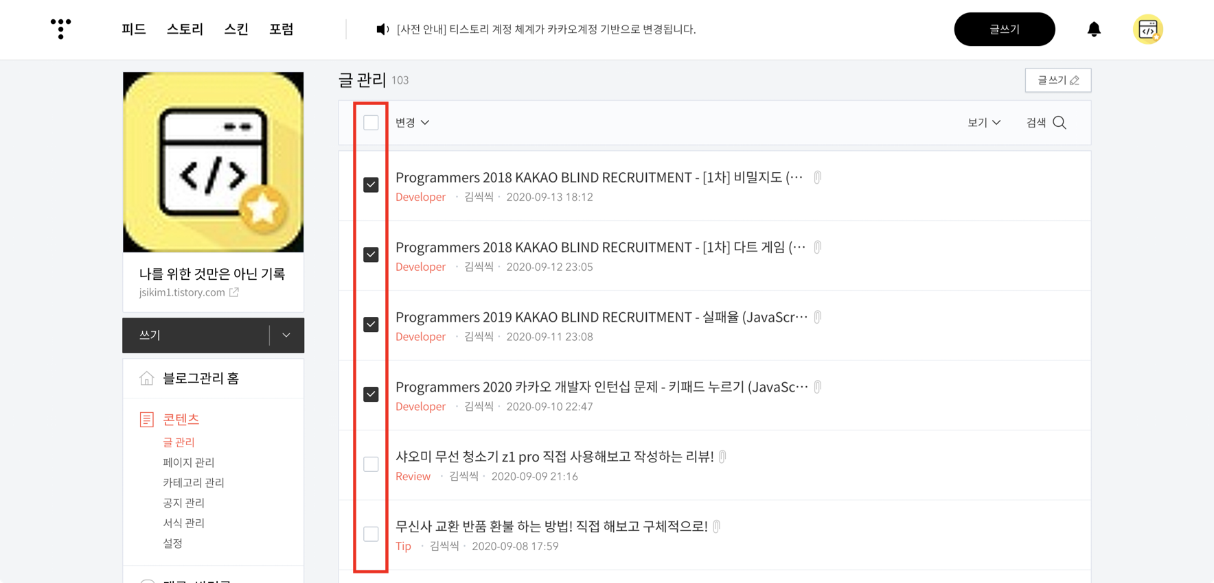 티스토리 글 여러개 카테고리 및 상태 한번에 변경하는 방법!